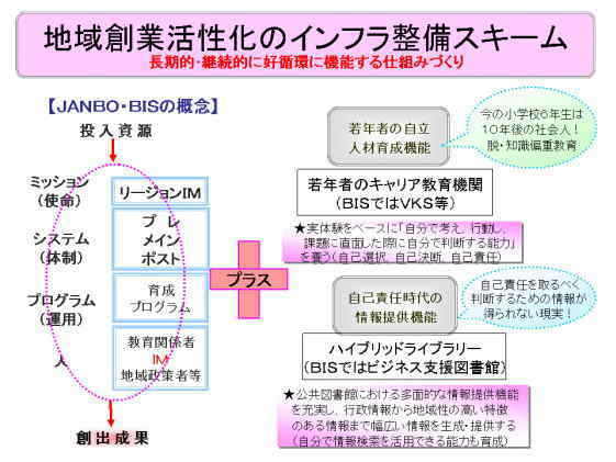 創業活性化の現状施策としてJANBO(日本新事業支援機関協議会)が2008年まで10年間で実施・構築してきたJANBO・BIS(ビジネス・インキュベーション・システム)があり、国内にインキュベータ235施設が全国に展開されていく中で、全国に約600名のIM(インキュベーション・マネージャー)を養成し、全国の新事業創出の一環を担っている。(JANBOは平成20年度でなくなり、その機能をJBIAが受け継ぎ、現在も活動開始中。) ![]() 我々は、これに加えて中長期的な施策の重要性を実感しており、社会インフラ整備の一環として「若年者の自立人材育成機能」と「自己責任時代の情報提供機能」の二つが必要ではないかと考えている。中長期的な施策が、ある段階から本格的に機能し始めた場合は、従来施策にはあまり金をかける必要がない時代を迎えるのではないかと考えている。行政のほうでも中長期的な施策に金をかけることで、税金投資のトータルコストも下がっていくのではないかと思う。 |