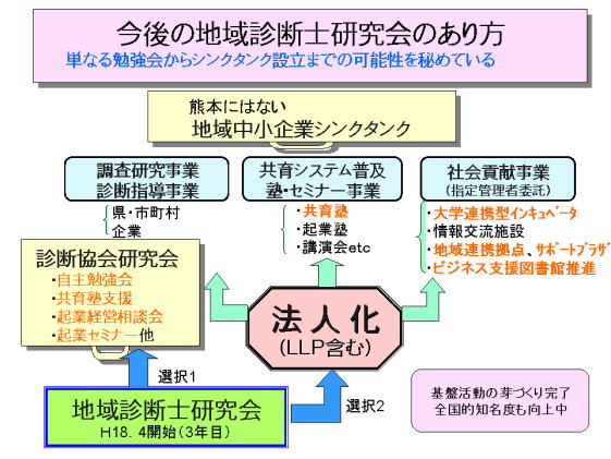 研究会メンバーの変化・成長・発展に合わせて、今からの地域診断士研究会のあり方の検討も始まっている。今後も、従来の診断協会熊本県支部の1研究会として活動していくのか、将来の地域シンクタンクを目指して、法人かも含めて、新たな活動にチャレンジしていくのかを、今年初めからみんなで検討を始めているところである。 地域診断士研究会は、時代の変化への対応を含めて、「これからの地域に必要な診断士活動の研究と実践」を趣旨として活動を始めたわけだが、活動の幅も広げながら、間違いなく変化・成長・発展をしてきている。このことは私の脱サラ後の活動の集大成というかライフワークが、私と無関係に継続されていく礎ができたことにも繋がり、長期的には、私の手を完全に離れて、熊本に必要とされる社会貢献集団として、活動していくことを期待したい。 |