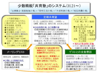 いろいろ振り返ってみると、私自身が相当時間を かけてやってきた自主企画の塾・セミナーとしては、 6年前に始めブラッシュアップしてきた共育塾の共育 システムがある。 この共育システムを原点に置いての塾やセミナーが、 いろいろ応用がきくのではないかと考えている。 というのは、人が育つことに関することを原点に置いて きた結果なので、当たり前のことかもしれない。 そうすると共育塾以外に、多様な自主企画のセミナー(若者向け目標設定セミナー、起業塾、起業セミナー、NPOセミナーなど)をすることで、多くの受講生に喜んでもらえるのではないかと思った次第である。 ←ホームページより 共育塾のシステム |