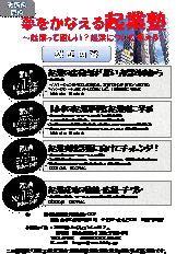 同じ頃に3回シリーズの起業セミナー(2H×3回)の相談を受けて、シリーズ企画を行った が、 私が常日頃から問題意識を持っていた一般的に開催されている「起業セミナー」を 脱却する企画を行うことにした。従来の起業セミナーは、「ビジネスプランの作成」に重点を 置いたものが殆どで、ビジネスプラン関連書籍で習得できる内容をメインにして行われて きた。シリーズ企画されたものも、単発の講座が組み合わされただけの一貫したストーリー 性に乏しい、また一方向性のものが殆どである。そのようなこともあり、「起業の成功確率を 上げ、起業の立上げ期間を短縮する」ために、起業家に伝えるべきことを企画に盛り込ん だ、「新たな起業家セミナー」の必要性を感じていた。 今回は有り難いことに、企画から関与できる機会を与えていただいたことで、過去10数年 間で200社以上の起業家支援を行ってきた経験と、この5年間で培ってきた若手経営者塾 である少数精鋭・共育塾のシステム・ノウハウを盛り込んだセミナーを企画し実践してみた。 |