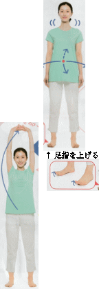 新しい年度が始まり、緊張や慣れない事で体も疲れてるでしょう。 そんな時15秒背伸び」で一気に疲れを取ってしまいましょう。 やり方 ①身体を揺らして重心を真ん中にする。 足を肩幅に開き、足指をあげる。そのまま身体を左右に軽く揺らし 2~3往復したら真ん中でとまる。 同様に前後にも揺らして止まる。 重心を身体の真ん中にキ-プしたまま、足指を下ろす。 POINT まっすぐ上へ伸びる為の準備 重心を真ん中にして足裏を安定させるため足指を上げ身体を揺らす。 親指・小指の付け根・かかとの3点がしっかり床につき、全身をくまなく 伸ばすことができる。 ②手を組んで裏返しゆっくり上へ伸びる。 手を組んで裏返し、手の甲をみて腕を伸ばしながらゆっくり上げる。 手と足で引っ張り合うように伸び、頭上まできたら手を離し、身体の 横から指先が遠くを通るように下す。 上げて下ろすまで15秒かける。 座ったままでもOK 腰を丸めずに坐骨をイスの座面に突き立てるようにする。 furakora4月号より |