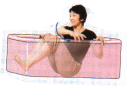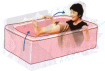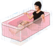 STEP @ ひざを曲げて座りバスタブのふちに手をのせる。 背中をバスタブにくっつけて、体を安定させる。 (注:バスタブに背中をくっつける時、反らすと腰を痛めます。) |