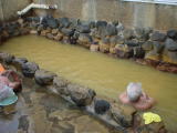 Aさくらじま白浜温泉センター・・・桜島町白浜 300円 塩化物泉、内湯、露天 桜島に行った時、偶然見つけた温泉です。茶褐色は鉄分豊富を感じさせます。火山灰を使ったマグマ泥湯が有名だそうで、風呂桶に火山灰が入っていて、これを体に塗って露天風呂に入ります。温泉成分と火山灰が混ざって血行にいいそうです。 |