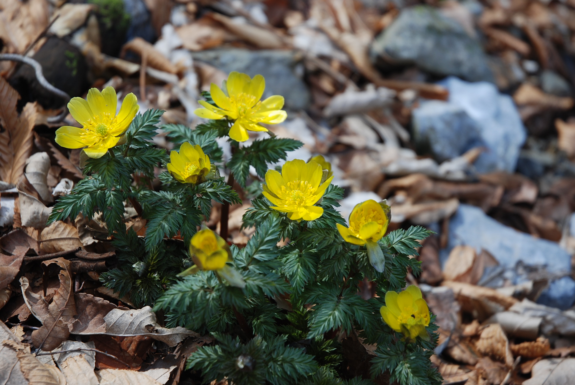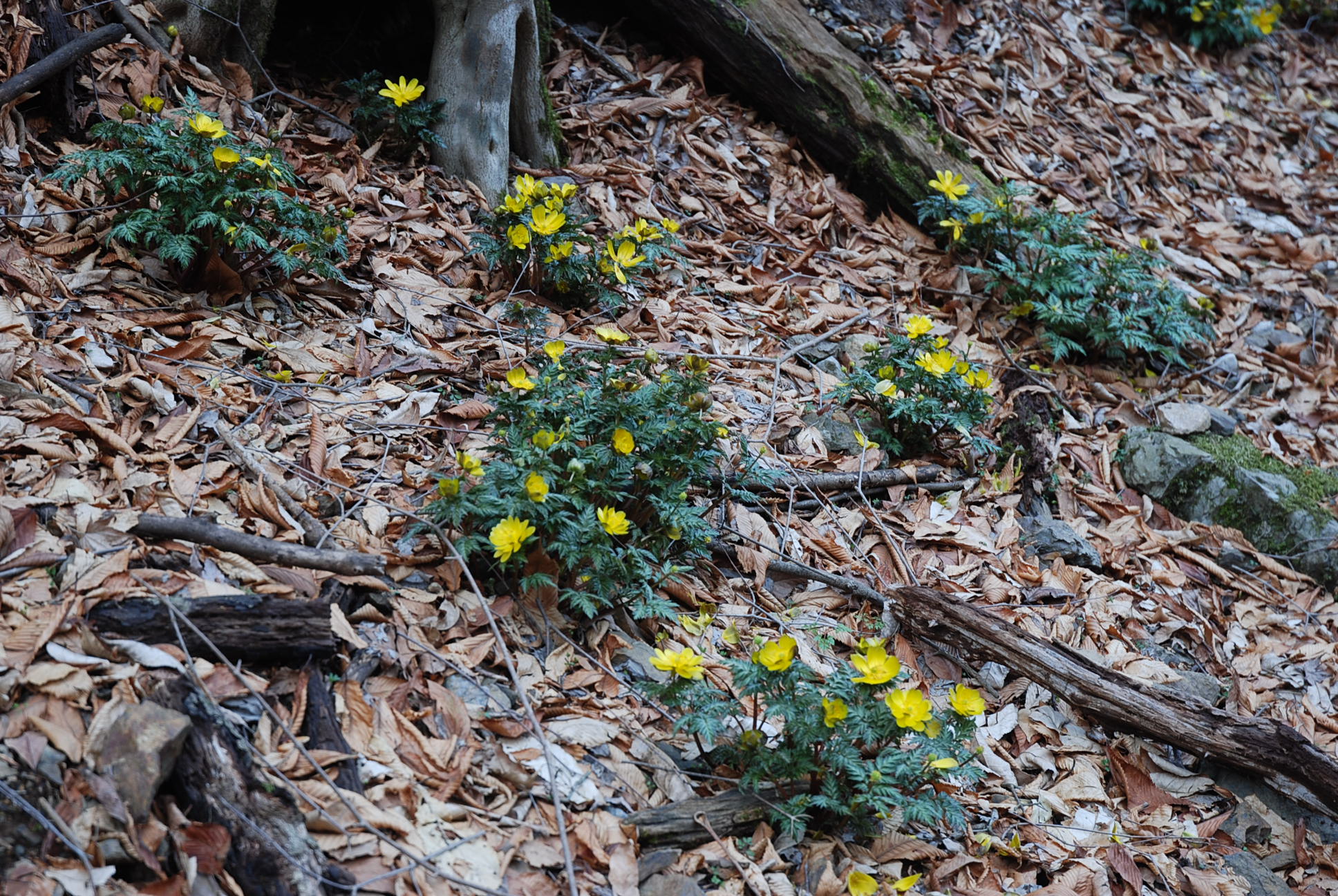 登山道脇に咲きほこる福寿草 |