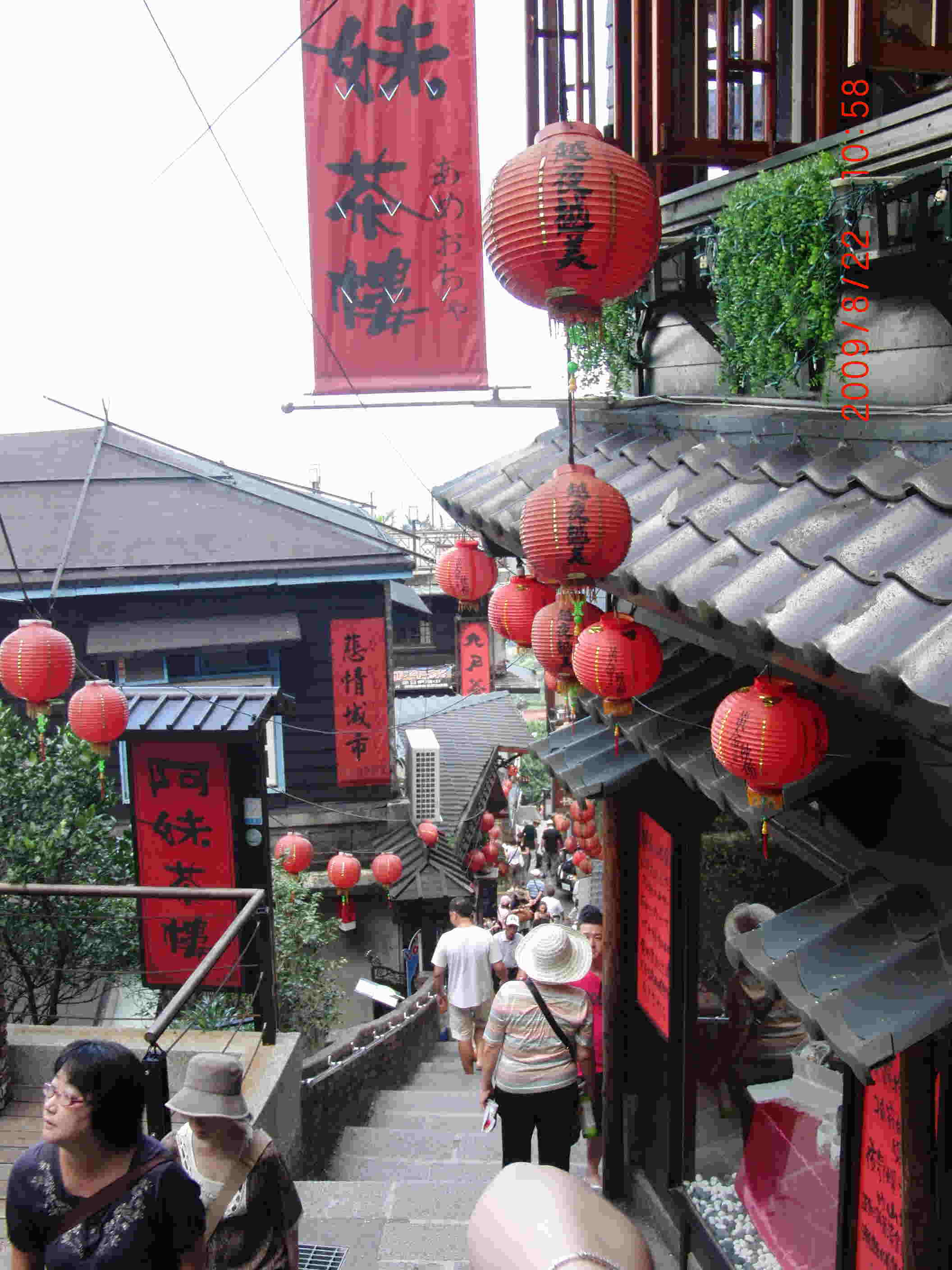 夏休み、台北中心に台湾旅行に行って来ました。映画『悲情城市』の舞台となった九分を訪れました。 台北からバスで50分位行くと、山肌にくっつくように街並が広がります。戦前、金山でにぎわっていた街は、閉山とともに衰退したため昔の街がそのまま残されていて、山の上に突然現われる不思議な光景にまるでタイムスリップしたかのようです。 |