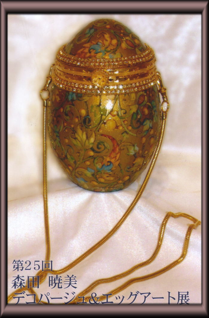 『第25回 森田暁美デコパージュ&エッグアート展』 日: 12月2日(水)〜12月7日(月) 時間:AM10:00−PM7:00 (最終日は5:00) 場所:アートスペース大宝堂 (熊本市上通りメガネの大宝堂地下) 連絡先:熊本市練兵町25-2-803 Tel:096-324-0833 |