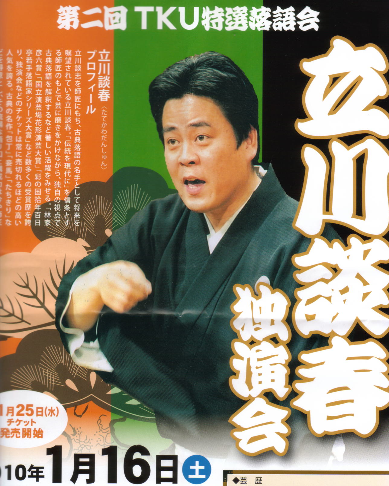 映画の感傷にひたったまま午後は、立川談春の独演会に行きました。談春の寄席は二回目で、やはり談志の弟子だけあって、流暢な語りは聞いていて引き込まれます。 演目はお花半七の馴れ初めの「宮戸川」、堅物な息子を親が心配し、お稲荷さん詣でと騙して吉原に行かせる笑話「明烏」。どちらも初めて聞く噺でしたが、それより何より師匠談志の話が一番面白かったです! 芸術鑑賞に充実した一日でした(^^) |