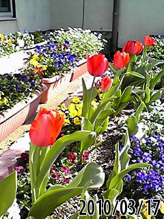 昨年の冬、レンガで囲いをつけただけの簡単な花壇を作りました。 寒さに強いビオラを植え、間には赤と黄色のチューリップの球根を2列に植えました。 3月に入ると気温も上昇。あっという間に赤の球根から芽が出て、日増しに背が伸びました。 赤の前列を彩ってくれるはずの黄色はまだ葉っぱだけ(*_*) おかしいぞ。遅い・・・。 満開の花を咲かせた赤は、3月半ばを過ぎると大きな花びらを盛大に散らして終わってしまいました。 |
