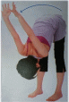 D耳の後ろのツボ刺激―足を前後に開いて耳の後ろのツボ(えい風)を刺激。 1本の線の上に立つようなイメージをもち前後に足をできるだけ開脚して右足を前に して立つ。耳たぶの後ろにあるくぼみを人差し指でがんきゅうに向かって押し込む ように刺激する。同時に眼球を左右2回ずつ回す。左足を前にして、同様に。(写真d) E肩甲骨を寄せるポーズ―後ろで親指を組んで前屈。 肩幅くらいに両足を開いて立ち、身体の後ろで左右の親指をひっかける。 親指を組んだまま、大きく息を吐きながら前屈。この状態で左右へぐるりと2回ずつ 回し、左右の目でウインクを2回ずつ行い、ゆっくりと体を起こす(写真e)。 Fくつろぎのポーズ―畳やじゅうたんのうえに仰向けに寝る。両手は体のわきから 少し離す。手のひらを上に向けリラックスさせる。 足は肩幅に開いて力を抜く。軽く目を閉じ、大きく鼻から息を吸い込んで下腹を ふくらませる。ゆっくり時間をかけて吐き出し、これを3回繰り返す。 (視力向上ヨガ―マキノ出版より抜粋) |