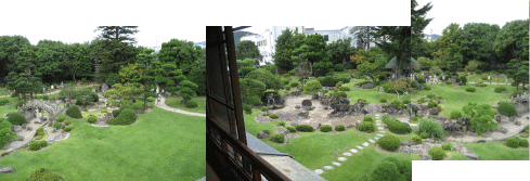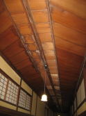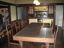 敷地約2、300坪・建物300坪・部屋数25部屋入ってすぐに暖炉のある応接間はステンドグラスがはめ込まれ、暖炉には桃の彫刻がしてありました。廊下の天井はまっすぐになってるんですが、船底をかんじるような変わった作り。1階には居間・本座敷・伝右衛門さんの居間・(広大なお庭がよく見える)中の間・角の間・次の間・子供室・台所・食堂(床は寄木造)でテーブルセットが置かれていました。 |