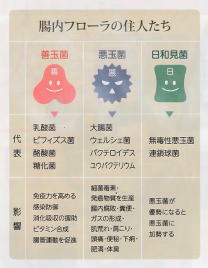 今年も後わずかとなりましたが、腸内環境を整え元気な新年を迎えましょう。 健康な人の腸内には、約100兆個もの腸内細菌がバランスよく住み着いている。 特に小腸の終わりから大腸にかけては腸内細菌がびっしりと敷き詰められているので 「腸内フローラ」と呼ばれている。この花畑には、大きく分けて善玉菌・悪玉菌・日和見菌の三種が共生して勢力争いをしている。 悪玉菌が優勢になると便秘や下痢・便が臭い・怒りっぽい・免疫力低下 善玉菌が優勢になると快便・臭いも少ない・体調良好・病気にかかりにくい。 日和見菌は悪玉菌が優勢になると悪玉菌に加勢する 日頃から善玉菌優勢の環境を整え、病気に負けない体を作りましょう。