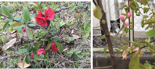 〇ボケの花・花梨の花 一昨年植木市で買った「ボケの花」、昨年は何故か大きな実をつけていましたが今年は見事に鮮やかな赤い花を咲かせてくれました。 ボケの隣に8年前に植えた「花梨の木」根っこは根切り虫にやられ、枝も強風で折れさんざんでしたが、嬉しいことに今年始めて蕾がつき4月になって今は何とも言えない優しいかわいいいピンクのお花が可憐に咲いています。 自然は偉大でたくましいですね。 |