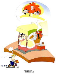 | 「春秋左氏伝」の成公1年の章に出てくる 晋の国の景公が病気になった為隣国の秦から評判の良い医者を 呼んだ。その医者がつく前に景公が夢を見た。 夢の中に二人の子供が現れて何やら相談している。二人は病の 精なのだ。 子供は「彼は名医なので、自分たちは痛みつけられるだろう。 何処かへ逃げ込んだがいいだろう」すると、もう一人の子供が 「膏の上・肓の下に逃げ込めば鍼も届かず薬も効かないだろう」 と言いました。 そしてこどもは膏の上・肓の下に逃げ込んでしまった。 そしてやってきた医者は早速景公を診察したが「殿様の病は膏の上・ 肓の下に入り込んでいてどのような方法でも治療が出来ません」と 告げた。 医者の見立てが夢のとうりだったので景公は彼を噂どうりの名医と 讃え多くの褒美を与えて帰国させた。 ということから「病膏肓に入る」とはての付けようがない病状を言う。 転じて物事に熱中しすぎててがつけられないたとえにも使われる ようになった。 膏とは心臓の下 肓とは横隔膜の上 |