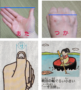 ①測り むかしは、ものさしの代わりに、体の部分を使って長さを 測っていました. 親指と中指の間の長さを「あた」 指4本分の長さを「つか」と言います。 親指の横の長さ「寸」***1寸は3㎝ 〈1寸法師・親指姫は親指の幅ぐらい小さいんですね。) 一寸は現在ではとても少ないというとき使われます。 自分の「あた」や「つか」を覚えておくと便利です。 ちなみに私の親指から小指までは18㎝ . ものさしのがなくものを図りたいとき大体の長さがわかり 便利です。 |