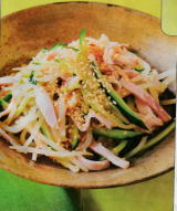 ②ハムともやし、きゅうりの和え物 材 料 ハム 適量 / きゅうり 1本 もやし 1袋 / 酒 大さじ2 調味液 塩 小さじ3分の2 / 砂糖 小さじ2 酢 大さじ1 / ごま油 大さじ2分の1 作り方 ①もやしをフライパンにいれて酒大さじ2をかけて強火でいる。 ②しんなりしたら水気をきって熱いうちに調味液に入れて しっかり なじませる。 ③冷めたらハム・細きりきゅうりを入れて混ぜ合わせる。 (JAF Mate8.9月号より) |