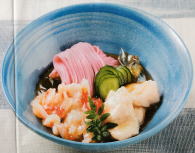 ①梅そうめんの冷やし鉢 材 料(4人分) そうめん 4束 とりささみ 2本 エ ビ 8尾 きゅうり 1本 めんつゆ 400cc 作り方 ①とりささ身は筋を取って観音開きにして片栗粉をまぶし て 3㎜程度のうすさになるまで叩きのばす。 ②エビは殻と背わたを取り腹開きにして①と同様にする。 ③きゅうりは塩もみ ④ ①と②を湯通しし、冷水に落とす。 粗熱が取れたら3㎝幅にきる。 ⑤茹でためんの上に③と④をのせ、めんつゆをかける。 (CHARLEカフェ7月号より) |