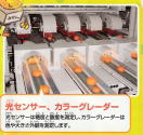 | 工程 荷受(農家の方がミカンを運んでくる) --->ミカンの品種、コンテナの数などを入力して荷受場におろす--->予措庫(ミカン保存専用の倉庫)に運ぶ--->機械で選果機まで運ぶ--->選別(2回に分けて、人の目で規格外等を取り除く --->光センサー、(糖度と酸度)カラーグレーダ-(色や大きさや外観)で測定 --->箱詰め(糖度、大きさ、外観別に仕分けされたミカンの重さを測って箱詰め) --->出荷 |