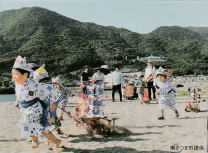色とりどりのガラガラ船が勢揃いするのが、毎年5月5日に泊地区で行われる「唐カラ船祭り」 新聞紙で作った兜をかぶった浴衣姿の男の子たちが、ガラガラ船を引きながら九玉神社まで練り歩き、神事の後には浜辺で一斉にレ-スを行います。 自分の背丈ほどのガラガラ船を引きながら走る姿は愛らしく、地元住民だけでなく県外からも多くの人が見に訪れるのだそうです。 子どもたちが、すくすくと育つようにと思いを込めて作られてきたガラガラ船。きっと未来でも、美しい坊津の浜辺には子供たちの声とともに「がらがら」と元気な声が響き渡っている