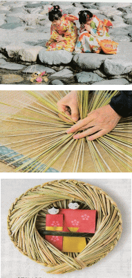 | 華やかな楽しい3月3日の「ひな祭り」も終わってしまいましが、 鳥取県鳥取市の山間の町の用瀬(もちがせ)町では今も旧暦3月3日に「ひな流し」が行われています。 今年は4月22日(土)。 「ひな流し」は、厄災をひとがたに移して川や海に流す行事から生まれた風習で、古くは源氏物語にも記述があります。 用瀬町では毎年10月ごろから春まで、週2回ほど集まり「流しびな」を作っているそうです。 さん俵に小さなひな人形がのった「流しびな」が数百も水面に流れる様子は圧巻で風情に富んだ情景だと聞きました。 *さん俵とは、こめ俵の両端を塞ぐ丸いふたのことで、藁をお湯で柔らかくして束ねた後、中心に円形の板を乗せ、花のように広げてあんでいきます。 人形は紙粘土を丸めて、乾いてきたら白塗り。男雛には冠を被せ、丁寧に顔を描いてから、紙の着物を着せていきます。 観光客も流しびなができるようです。 3月3日のひな祭りは日本に残っている5つの節句のなかの一つです。 ● 5節句とは 1月7日----人日 七草の節句 3月3日----上巳 桃の節句 5月5日----端午 端午の節句 7月7日----七夕 七夕の節句 9月9日----重陽 菊の節句 ダスキン喜びのタネまき新聞より |
