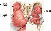 それぞれの筋肉の特長 ●大臀筋はお尻の中で最も大きな筋肉。骨盤の後ろから太もも横までのびている。 歩く、走る、立つ、椅子から立ち上がる、といった動作に大きく関わっている。 ●中臀筋はお尻の横あたり(腰に手を置いたところから5〜10センチほど下)にあり、大部分を大臀筋に覆われている三角形の筋肉。歩く、走るの他に片足でバランスを取る際に体を支えるサイドステップなどの動作に関わっている。 ●小臀筋は股関節の外側(おしりの外側)にあり中臀筋の奥についていて、一番深層にある。 中臀筋と同じような働きですが、股関節を開く動作や歩く時に骨盤を支える役割をしている。 |