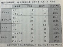 毎日の食事の中で、今日はタンパク質が少ないかな?とは思ってもミネラル分が少ないなと思ったことありますか?野菜食べなきゃ!味噌汁食べなきゃ!と思われる方は多いかも知れません。昔は、今のようなアレルギーや、アトピー、発達障害等々の病気はなかった、少なかったとよく耳にしますね。前回も書きましたが、いろいろな要因の1つが食の欧米化や添加物の多量摂取、農業の変化などの私達の食生活に関わるものです。1950年代と2000年代の作物の栄養成分を見てみましょう。ミネラルである鉄分が非常に少ないことが分かります。では、ミネラルは実際、どのような働きをしているのか紹介しますね。 |