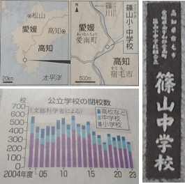 | 愛媛と高知の県境にあり、「日本一名前の長い学校」として知られる小・中学校が少子化で在校生9人になった為、70年以上の歴史に幕を下ろします。 愛媛県と高知県の2県から児童が通う珍しい学校です。校名は 「高知県宿毛市愛媛県南宇和郡愛南町篠山小中学校組合立篠山小中学校」です。長いですね。 学校のすぐ横を流れる川が県境になっていますが、「両県の子供が通えるように」と1949年に中学校が1952年に小学校がつくられました。1957年には小・中学校で計300人を超えていましたが、少子化が進み2025年度には、小学生3人中学生は全員女子で6人でした。 |